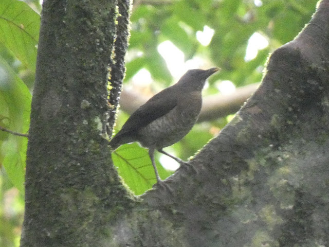 We carried on upward just for one more bird. The trail got steeper and more difficult and after a while Lynne and Neil decided not to carry on and went back to the campsite with one of the guides. Tim and I pushed on as the path got steeper and about 15 minutes later we made it to the first ridge. Our guide began whistling and soon attracted the attention of our quarry: Sao Tome (or Newton’s) Fiscal. Luckily for us it came in and landed close by, singing back at us.